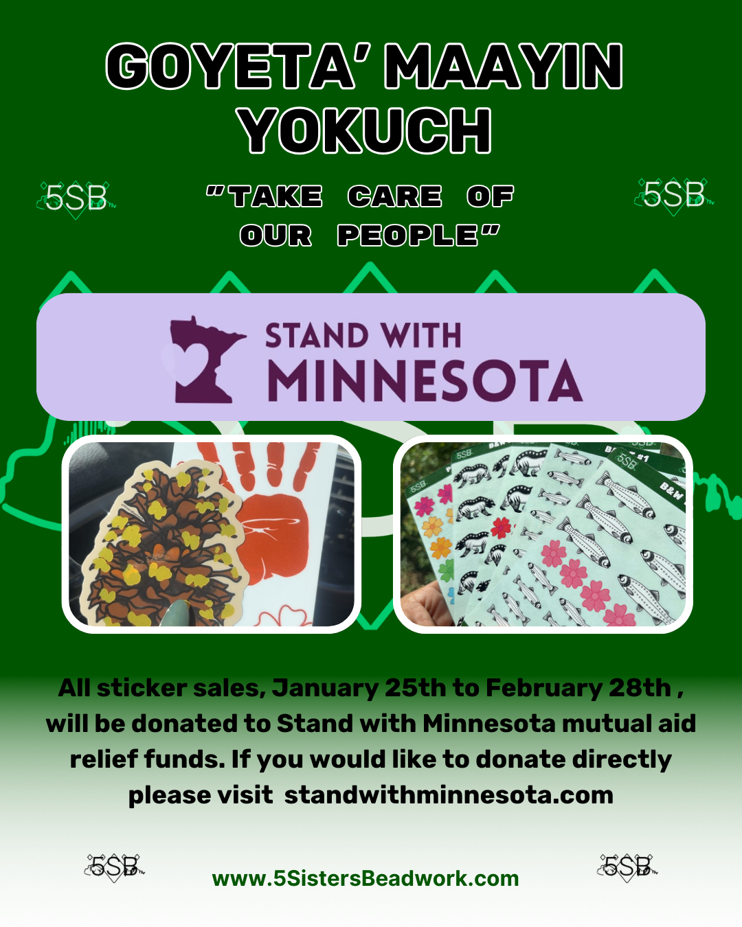 All 49 5SB stickers and sticker sheets are included in this listing. 100% of all sales from this listing will go directly to the mutual aid relief funds through Stand With Minnesota on March 1st, 2026.